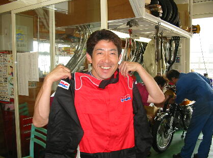 何時もはアライのエプロン姿でしたが、HRCから今届いたばかりのツナギを合わせて パチリ!!お似合いですよ!!この後 タディー なま着替え・・・タディーは根っからのバイク好きで、今CBに夢中です。今日は朝からクランクケースの洗浄に夢中でした。(大好きなんですね)