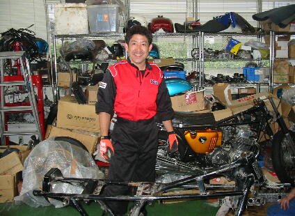 外装部品を取っ払い、遂にフレームだけに! この後、塗装を剥離 錆び取りを行ないました。ん〜〜 今日もいい仕事してます!! 人柄の良さが写真からにじみあふれてますね!!