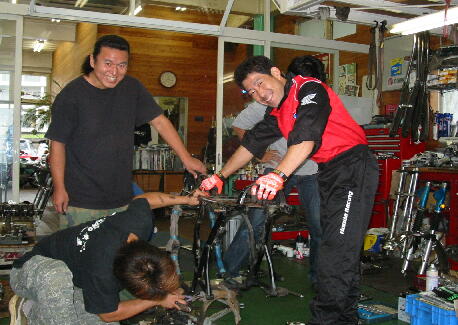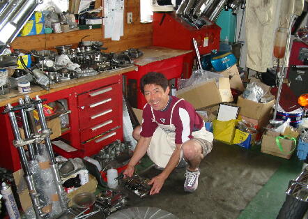 大物の正体は・・・ 元GPライダー 世界の岡田さんアライのエプロン姿で、愛車のエンジンO/Hに熱中してます。時間があれば何時でもマシンをイジクッテま〜す。本当は何でも自分で やりたい派なんです。